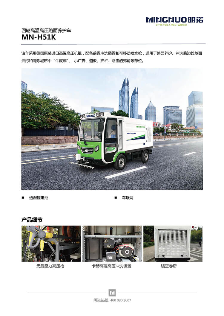 四輪高溫高壓養護車采用德國原裝進口高溫高壓機組,配備前置衝洗裝置和可移動噴水槍,適用於路麵養護、衝洗路邊攤地麵油汙和清除城市中“牛皮癬”、 小廣告、道板、護欄、路崖的死角等部位。