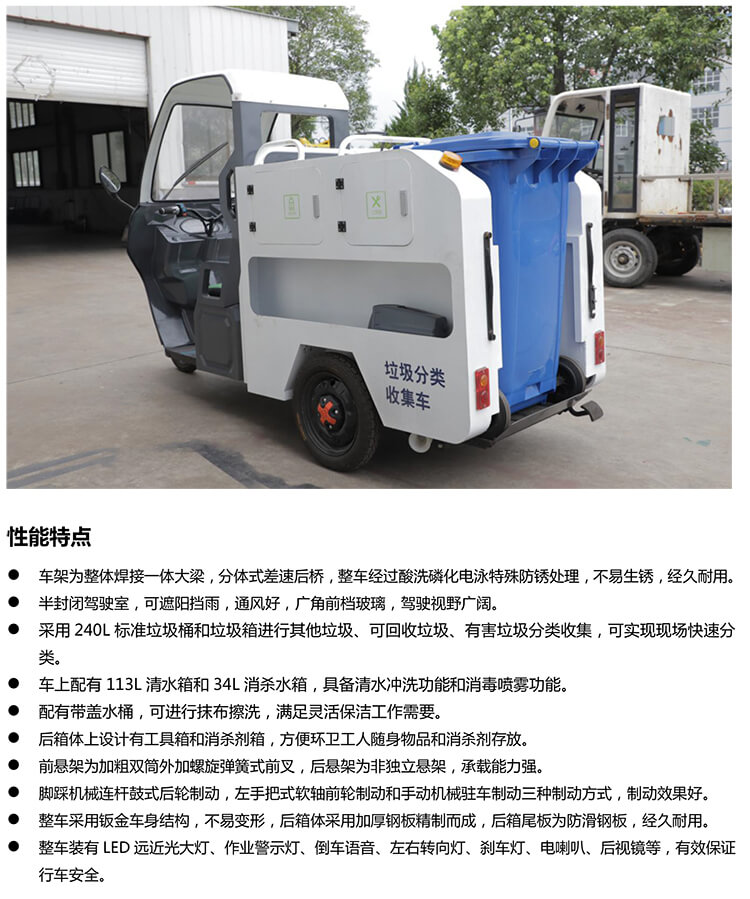 午夜激情视频垃圾分類三輪雙桶保潔車,采用240L標準垃圾桶和垃圾箱進行其他垃圾、可回收垃圾、有害垃圾分類收集,可實現現場快速分類。配有小型水箱,具備清水衝洗功能和消毒噴霧功能,滿足靈活保潔工作需要。整車操作簡便、耐用、省時、省力,小巧靈活,且易清洗,極大地減少人力,提高保潔效率。