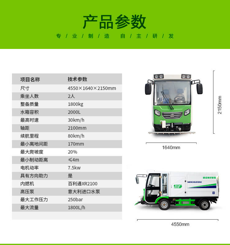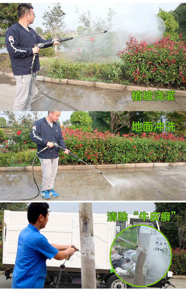 該車配備前置衝洗裝置和可移動噴水槍,可用於路麵養護、地麵清潔、植被清潔澆灌、建築物雕像清潔等,也可用於消毒和噴灑農藥。適用於路麵養護、衝洗路邊攤地麵油汙和清除城市中“牛皮癬”、 小廣告、道板、護欄、路崖的死角等部位。